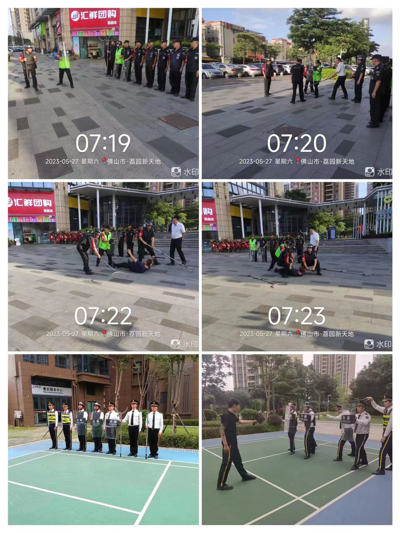 演练模拟事件在小区广场,一名外来人员在小区广场无端辱骂过路行人,当班保安人员立即通知就近安保人员迅速到场对施暴者进行劝阻,在劝阻无效后,立即启动应急预案,此时施暴者情绪失控,防暴小组队员手持盾牌、钢叉等防护器材向闹事者逼近,形成隔离圈后,把握时机快速对其进行合围将其制服并移交公安机关处理。