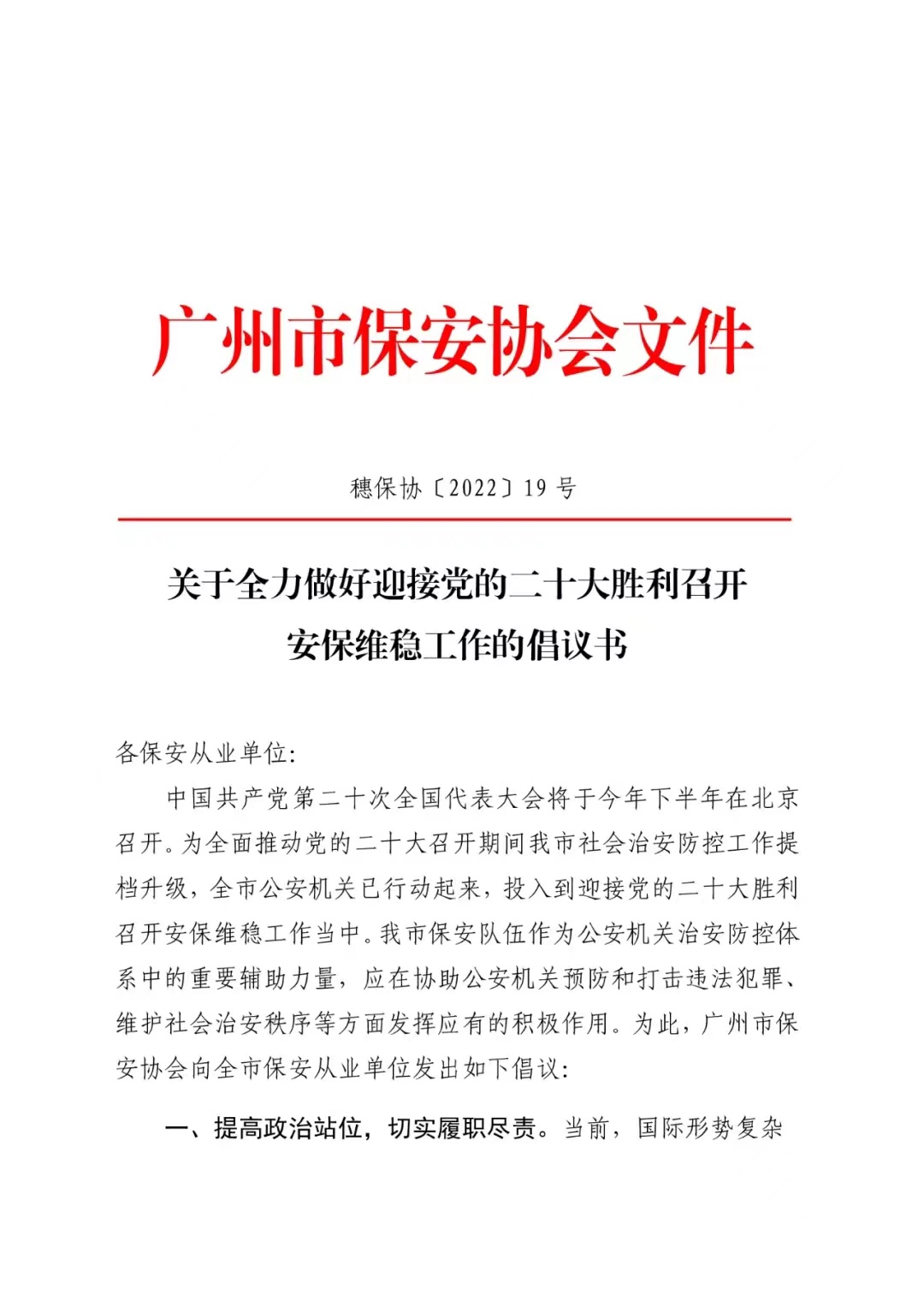 全力做好党二十大胜利召开安保维稳工作倡议书